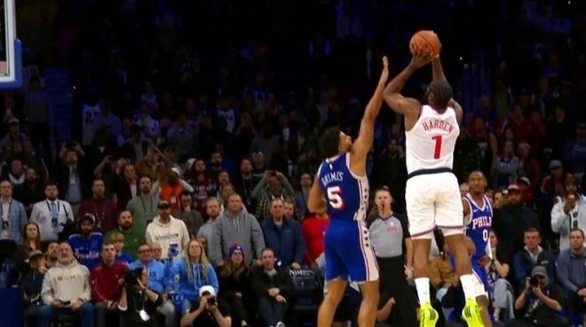这一幕发生在比赛最后还剩7秒时,快船队落后2分,泰伦卢叫了暂停后,为哈登安排了一个一对一单打的战术,哈登通过节奏变化拉开出手空间后直直跳起出手三分,试图补防的格莱姆斯直接打到哈登的手肘,结果裁判并没有表示,也没有进行回看。